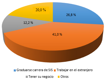 Para finalizar, se les solicitó a los estudiantes encuestados que dijeran sus tres deseos más importantes en orden de prioridad. Solo el 26,8 % incluyó el deseo de graduarse de la carrera de SIS; el 41,0 % deseaba como primera prioridad viajar o trabajar en el extranjero; el 12,0 % tener su propia empresa o negocio; y el 20,0 % mencionó trabajar en un hospital, tener amor y suerte, crear videojuegos, tener una familia unida y obtener su propia casa (Fig. 2).