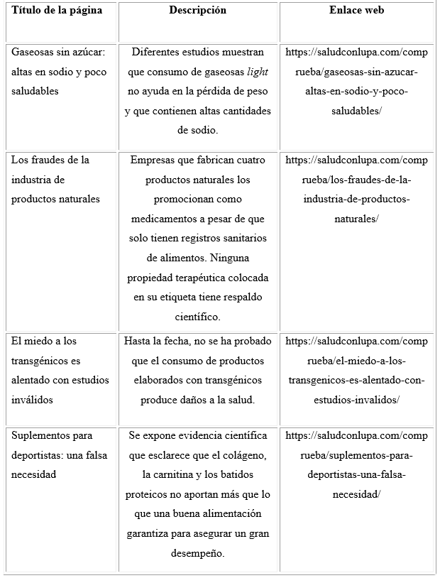 Recientemente, un grupo de periodistas con la colaboración de colegios profesionales, sociedades científicas, universidades, think tanks y colectivos civiles de salud han promovido la iniciativa denominada “Salud con Lupa”, un sitio web que busca combatir la campaña de desinformación sobre salud a través de la comprobación de hechos o verificación de datos (sección denominada fact-checking). Es promovida para “contrastar datos y difundir información confiable sobre salud en Internet”.16 El cuadro muestra una selección de páginas de la sección “Comprueba” del sitio web “Salud con Lupa”.