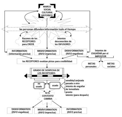 Las autoras expresan que, aunque la desinformación puede compartir propiedades con la información y con la información imprecisa, la desinformación es por naturaleza decepcionante, pues las intenciones que la guían son desconocidas y pueden tener su origen en una motivación social, en valores culturales y personales. También pueden tener determinados propósitos de carácter institucional, político, o personal. En general, Karlova y Fisher expresan que, aunque la información imprecisa pueda ser falsa y la desinformación verdadera, ambas constituyen subcategorías de la información. Las autoras representan, además, en un modelo la difusión social de la información, la desinformación y la información imprecisa (Fig.) como productos de procesos sociales.