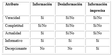 De acuerdo con los elementos mencionados anteriormente, la siguiente tabla de Karlova y Fisher29 sintetiza algunos atributos de la información, la desinformación y la información imprecisa.