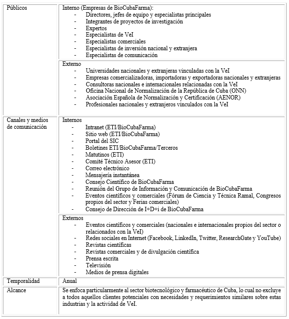 El proceso de comunicación desde su dinamismo, complejidad, intersubjetividad e interacción social constituye componente en la gestión del SIC para la co-creación, difusión y promoción de los productos y servicios informacionales de VeI como sustento de la toma de decisiones. En tal sentido, la implementación de la comunicación se enfocó en sus dimensiones instrumental y operativa, a partir de su materialización en un plan cuyo sistema de objetivos, estrategias y tácticas, y la propuesta de evaluación, responden al marco regulador y normativo del SIC, así como a los resultados del diagnóstico info-comunicacional. De igual manera se orienta, a través de las acciones planificadas, a la interactuación entre las partes interesadas del SIC en un entorno reticular, participativo, de responsabilidad social y potenciador de cambios culturales y de aprendizaje continuo, en pos de la institucionalización y de la construcción de una comunicación efectiva del proceso de VeI para el crecimiento de los miembros de la comunidad sectorial de BioCubaFarma.
