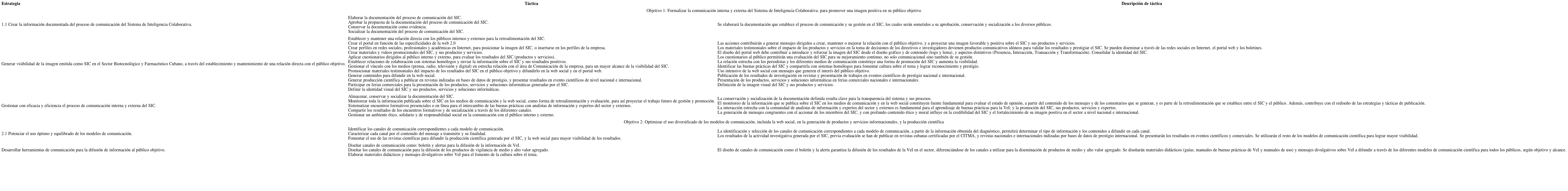 Posteriormente, se procedió al diseño del Plan de Comunicación del SIC. En tal sentido, se estableció un sistema de objetivos y se definieron las estrategias para cada objetivo específico con sus correspondientes tácticas, incluyendo su descripción (Fig.). En el cuadro 2 se presentan también las estrategias y las tácticas con su descripción para cada objetivo específico.