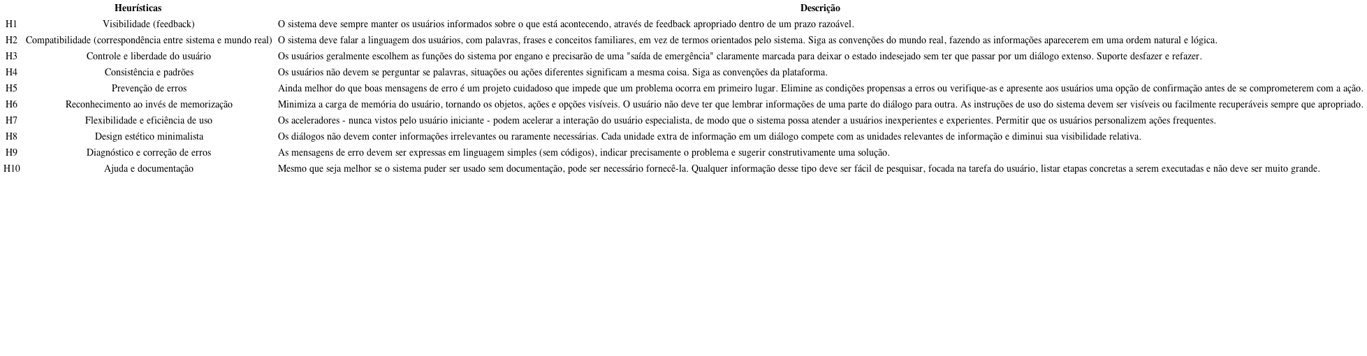 Utilizou-se como referencial teórico a Avaliação Heurística, que é um método indireto de avaliação de usabilidade por inspeção proposto por Nielsen.10,14) Tal avaliação consiste na verificação de uma lista de 10 heurísticas (regras) pela lente de especialistas com expertise na área, podendo ser aplicado em qualquer fase do ciclo de desenvolvimento do software e visa de forma econômica, fácil e rápida, descobrir grandes problemas potenciais da interface. As Heurísticas propostas são descrita no quadro 1.