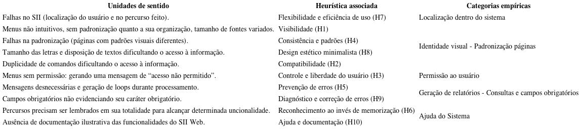 Isto possibilitou identificar as ideias (unidades de sentido) e a partir delas, construir as categorias empíricas que foram confrontados segundo os problemas de qualidade existentes na usabilidade do SII Web. Foram elas: Localização dentro do sistema; Identidade Visual/Padronização Páginas (Tamanho de fontes, Estrutura de menus); Permissão Usuário; Geração de Relatórios /consultas e Campos obrigatórios; Ajuda do Sistema.