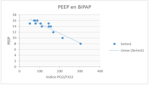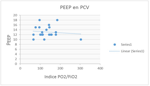 Results: the survival was 76.7 %. The used mode showed the same behavior in deceased patients (BiPAP-3, PCV-4, VCRP-4, APRV-5, VCV-4) and in alive patients (BiPAP-10, PCV-17, VCRP-14, APRV-15, VCV-10). X2 = 0.59. ANOVA test index PO2/FIO2 (PCV = 132), (BiPAP = 132) (VCV=115) p = 0.924. PEEP (BiPAP-12, PCV-13, VCRP-13, APRV-13, VCV-14) p = 0.205. PCO2 (BiPAP-55, PCV-52, VCRP-57, APRV-59, VCV-57) p = 0.512. Average blood pressure (BiPAP-84, PCV-83, VCRP-84, APRV-82, VCV-83) p = 0.988. PEEP models according to ventilation mode: BiPAP: PEEP = -0.0331 (PO2/FiO2 index) +18.215. PCV: PEEP = -0.0047 (PO2/FiO2 index) + 13.717; VCRP: PEEP = -0.0204 (PO2/FiO2 index) + 15.678; APRV: PEEP = -0.0092 (PO2/FiO2 index) +14.889.