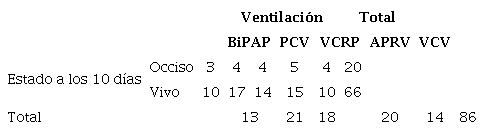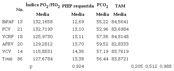 Resultados: Hubo una supervivencia del 76,7 %. El modo utilizado tuvo igual comportamiento en occisos (BiPAP-3, PCV-4, VCRP-4, APRV-5, VCV-4) y en vivos (BiPAP-10, PCV-17, VCRP-14, APRV-15, VCV-10); test de x2 = 0,59; test de análisis de la varianza media índice PO2/FIO2 (PCV = 132), (BiPAP = 132) (VCV = 115) p = 0,924. La presión de final de espiración positiva (BiPAP-12, PCV-13, VCRP-13, APRV-13, VCV-14) con p = 0,205. PCO2 (BiPAP-55, PCV-52, VCRP-57, APRV-59, VCV-57) con p = 0,512. La tensión arterial media (BiPAP-84, PCV-83, VCRP-84, APRV-82, VCV-83) con p = 0,988. Modelos de cálculo de la presión de final de espiración positiva, según modo ventilatorio: BiPAP: PEEP = -0,0331 (índice PO2/FiO2) +18,215; PCV: PEEP = -0,0047 (índice PO2/FiO2) +13,717; VCRP: PEEP = -0,0204 (índice PO2/FiO2) +15,678; APRV: PEEP = -0,0092 (índice PO2/FiO2) +14,889.