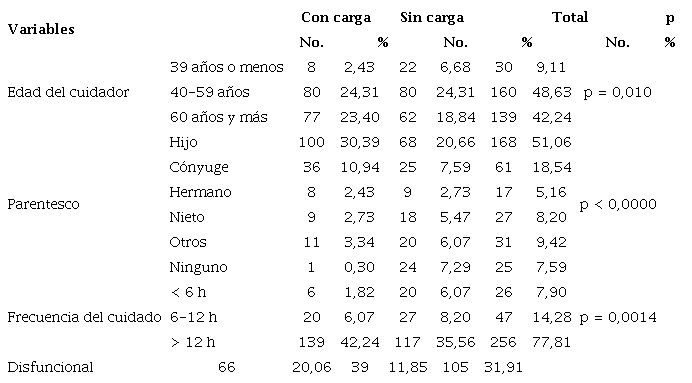 Materials and methods: cross-sectional analytical observational study (of cases and controls), carried out in San Miguel del Padrón, from January 2013 to December 2015. The authors studied 329 caregivers chosen by intentional non-probabilistic sampling, belonging to the six health areas of that municipality. The dependent variable was the burden, and the independent ones were those related to the caregiver, the elder person and the family. For percentage differences or contingency tables Pearson's Chi2 was used, with the prefixed error size of p ≤ 0.05. The multiple logistic regression with dichotomous answer was used to identify the possible burden risk factors.