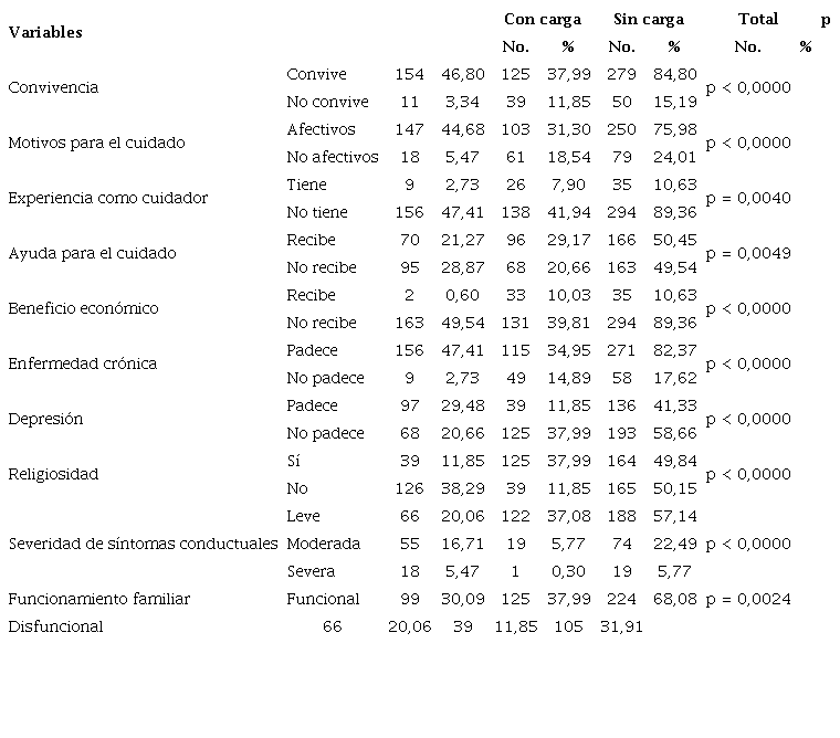En las tablas 2 y 3 se aprecia que en el análisis univariado de las 28 variables estudiadas (18 del cuidador, 9 del enfermo con demencia y 1 de la familia), 13 variables mostraron una relación significativa (p ≤ 0,05) con la carga; estas fueron: la edad del cuidador, el parentesco, la convivencia, el tiempo como cuidador, la frecuencia del cuidado, la experiencia como cuidador, la ayuda para cuidar, beneficio económico por el cuidado, padecer enfermedad crónica, depresión, religiosidad, beneficio económico por el cuidado, severidad de los síntomas psicológicos conductuales y el funcionamiento familiar. De ellas, las once primeras hacen referencia al cuidador, una pertenece al anciano enfermo -la severidad de los síntomas psicoconductuales-, y la última a la familia.