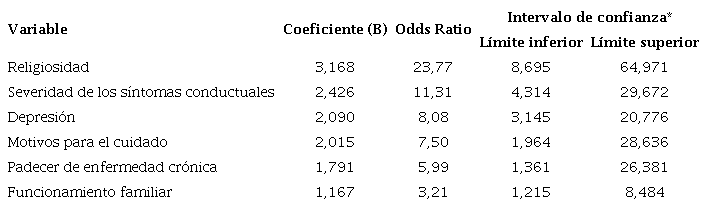 La depresión mostró un OR de 8,08, lo cual muestra que es ocho veces más probable la aparición de sobrecarga en los cuidadores que padecen depresión que en los que no la tienen. En relación con los motivos para el cuidado, el OR resultó ser de 7,50; esto significa que es 7 veces más probable la sobrecarga en los cuidadores que tienen motivos afectivos para el cuidado que los que cuidan por motivos no afectivos.