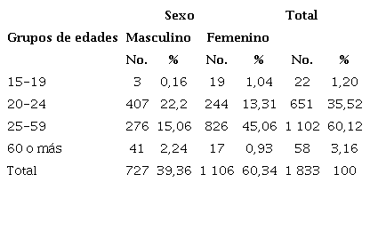 En el análisis del comportamiento de las variables sexo y edad, la tabla 1 muestra un predominio del sexo femenino (60,34 %) y del grupo de edad 25-59 años (60,12 %), en el que las mujeres representaron el 45,9 %.
