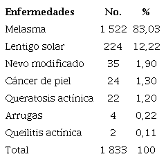 Después de realizar el examen dermatológico a las personas objeto de estudio, se constató en la mayoría la presencia de melasma y lentigos. El resto presentó otras alteraciones producidas por el efecto solar. Según el protocolo del Programa Nacional para la Atención Integral de Niños y Adolescentes con DAC, dentro del diagnóstico clínico del DAC están incluidos el cáncer de piel, las efélides, las discromías, las atrofias, las arrugas, la QA, la queilitis actínica y las alteraciones de los anejos oculares.1