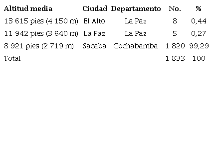 La información obtenida demostró que la zona de altitud donde residía la mayoría de los pacientes estudiados, era superior a los 2 000 m sobre el nivel del mar, ubicada fundamentalmente en el municipio Sacaba, departamento de Cochabamba, donde está enclavado el hospital comunitario. Fueron atendidas, además, personas procedentes de La Paz, por razones de migración transitoria.