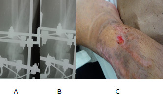 Al llegar al acople de los extremos óseos fue necesario retirar partes blandas interpuestas, recanalizar ambos extremos y dar compresión debido a la esclerosis de estos. A las cuatro semanas se dinamizó el foco de acople con apoyo parcial por ocho semanas, y se retiró el fijador después de la evidencia radiográfica de consolidación ósea. (Figura 3)