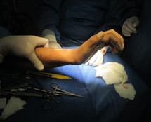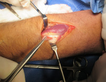Exposición del cubital anterior del carpo y desinserción del pisiforme, evitando lesionar el paquete vasculonervioso cubital. El músculo se moviliza proximalmente hasta medio antebrazo y se coloca una sutura nylon 3-0 usando la técnica descrita, y se envuelve con una gasa humedecida en solución de cloruro de sodio al 0,9%. El palmar menor se secciona donde se inserta en la aponeurosis palmar.