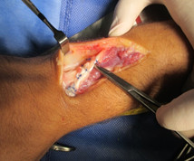 Con el hemostato se pasa el tendón extensor largo del pulgar. Se debe obtener una movilidad libre del tendón por el túnel creado.