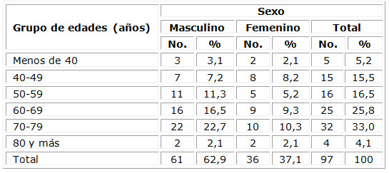 En el período de estudio, fueron operados con el diagnóstico de cáncer rectal 97 pacientes. Según los grupos de edades, predominó el de 70-79 años, con 32 pacientes (33,0 %), y según el sexo, los hombres, que representaron el 62,9 %. (Tabla 1)