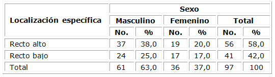 La localización específica más frecuente del tumor a nivel de recto alto no muestra diferencias importantes entre ambos sexos.14) En Cuba afecta tanto a hombres como a mujeres de forma casi igual, pero el cáncer de recto es más frecuente en hombres, lo que coincide con lo registrado en la literatura.