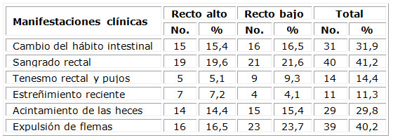 En la tabla 3 se describen las manifestaciones clínicas de la enfermedad que presentaron los pacientes. El sangrado rectal (41,2 %), la expulsión de flemas (40,2 %), los cambios del hábito intestinal (31,9 %) y el acintamiento de las heces (29,8 %), fueron los síntomas más frecuentes referidos por los pacientes. Según la localización del tumor, en ambas porciones del recto no existió diferencias.