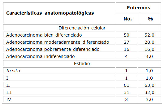 La tabla 4 muestra la variedad histológica tumoral más encontrada en el estudio por el Servicio de Anatomía Patológica. El adenocarcinoma bien diferenciado representó el 52 % del total. El mayor número de pacientes se encontraban en los estadios II y III del cáncer de recto, con 63,0 % y 32,0 % respectivamente, según la clasificación TNM (tumor, nódulo, metástasis).