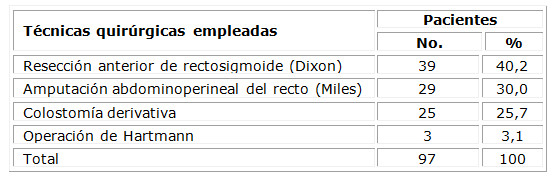 Materials and methods: a descriptive observational study was carried out. The universe was 97 patients of both sexes, who underwent a rectal cancer surgery. Data were obtained from individual medical records. Variables such as age, sex, specific tumor location, clinical manifestations, anatomopathologic characteristics and stages of the disease, surgical technique used and post-surgery complications during the first seven days were analyzed. The statistical method used was the frequency distribution, in absolute values and percentages.