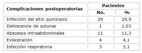 Entre las complicaciones postoperatorias presentadas durante los primeros siete días, la infección del sitio quirúrgico fue la de mayor ocurrencia, en 29 de ellos (29,9 %), seguida de los abscesos intraabdominales y la evisceración, con el 11,3 % y 4,1 % de ocurrencia, respectivamente. (Tabla 6)