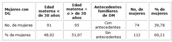La DG tuvo un comportamiento semejante entre los grupos de mujeres menores y mayores de 30 años, teniendo en cuenta que el número de embarazadas en ambos fue similar; 74 gestantes tenían antecedentes familiares de DM y hubieran podido recibir asesoramiento genético en su totalidad para minimizar sus riesgos, como se observa en la tabla 1.