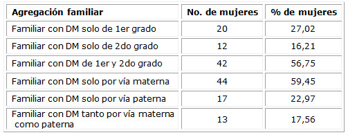 Resultados: el 39,7 % de las gestantes con diabetes gestacional pertenecían a familias con diabetes mellitus; el 27,02 % tenía un familiar de primer grado afectado; en el 59,45 % predominó la vía materna de transmisión hereditaria; un 22,58 % presentó defectos congénitos, y el 54,05 % no recibió asesoramiento genético preconcepcional.
