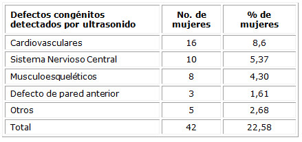 Se presentaron defectos congénitos en 42 mujeres (22,58 %), predominando los cardiovasculares -representados en primer término por la comunicación interventricular-, los del sistema nervioso central con las ventriculomegalias, y los musculoesqueléticos con los defectos vertebrales. (Tabla 3)