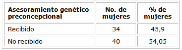 De las 74 gestantes que tenían antecedentes de DM, 40 no recibieron asesoramiento genético previo al embarazo, lo que nos alerta sobre la subutilización de las consultas de riesgo preconcepcional. (Tabla 4)