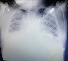En la figura, se muestra una radiografía de tórax realizada al ingreso del paciente en la UCI. En esta se observa la presencia de edema pulmonar no cardiogénico, que corresponde con un distress respiratorio del adulto, así como derrame pleural en hemitórax derecho.