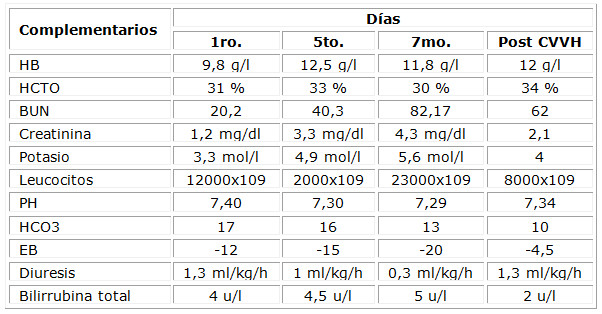 En la tabla 1 se muestra la evolución desde el punto de vista de complementarios, los días en que trascurrió su enfermedad, y cómo se empeoro la función hepática, renal, hematológica, así como apareció desequilibrio hidroelectrolítico y acido básico. Evolutivamente, se aprecia cómo fueron mejorando los resultados desde que se instauró la terapia renal continua y su recuperación, después de retirada la CVVH a los tres días de su uso.