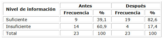 En la tabla 1, al analizar el nivel de información sobre el germen causal de la COVID-19, se observa que antes de la intervención educativa el 60,9 % de los abuelos presentaron un insuficiente nivel de información. Luego de aplicar el programa educativo se logró obtener un suficiente nivel de información sobre el tema en el 82,6 % de los encuestados.