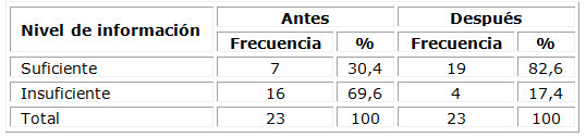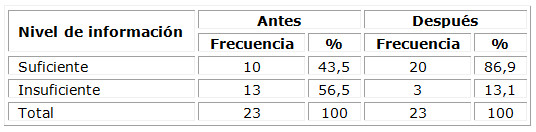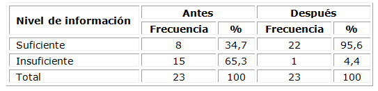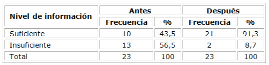 En la tabla 2 se muestra el nivel de información sobre las manifestaciones clínicas. Nótese que antes de la estrategia educativa, el 56,5 % de los participantes en el estudio presentaron un insuficiente nivel de información. Para suplir las dificultades encontradas se impartió el tema 2 del programa educativo, que trató sobre los signos y síntomas de la enfermedad, y se logró incrementar en el 91,3 % de los longevos el nivel de información sobre el tema.