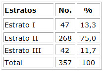 La tabla 1 muestra la estratificación de las manzanas según riesgos. Se observó que de las 357 manzanas, 268 estaban en el estrato II, para un 75 %; 47 en el estrato I (de alto riesgo), para un 13,3 %. Un 11,7 %, representado por 42 manzanas, fueron de bajo riesgo y ubicadas en el estrato III. Las 47 manzanas del estrato I pertenecían a las circunscripciones 24, 25 y 26 del área urbana del policlínico, con un total de 1 880 locales y 7 520 moradores.