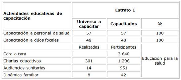 Los resultados del componente educativo de la estrategia para reducir arbovirosis, se muestran en la tabla 2: un 100 % de capacitación al personal de salud y a los dúos focales de la comunidad, representado por 57 y 48 capacitados respectivamente. Las actividades de educación para la salud alcanzaron al 97 % de la población que se debía capacitar, abarcando a 5 936 moradores -con 3 640 caras a cara, 301 charlas educativas con 1 296 participantes, 14 audiencias sanitarias con 951 participantes y 8 dinámicas familiares con 42 presentes.