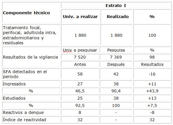 La tabla 3 muestra los resultados del componente técnico de la estrategia para reducir arbovirosis. Se cumplió al cien por cien el tratamiento focal, perifocal, y el adulticida intra, extradomiciliarios y residuales. En el caso de la vigilancia fueron pesquisados 7 369 de un universo de 7 520, para un 98 %. En el período de estudio se detectaron 16 síndromes febriles agudo (SFA) menos -antes se habían detectado 58 en igual período y luego 42. En cuanto al ingreso de los 42 síndromes febriles agudo, se logró aislar 38 (90,4 %), indicador positivo ya que antes solo se logró ingresar el 46,5 %. La aplicación de la estrategia permitió estudiar el cien por cien de los casos ingresados con 0 % de reactividad, disminuyendo en 32 % con relación al período anterior a la aplicación de la estrategia.