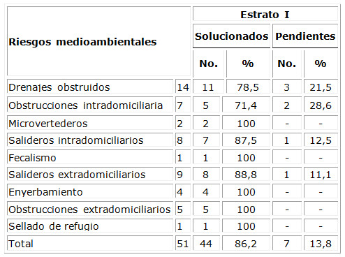 Los resultados del tratamiento comunitario e intersectorial de los riesgos medioambientales se evidencian en la tabla 4: se presentó un nivel de reducción de los riesgos en un 86,2 %. Los riesgos de microvertederos, fecalismo, enyerbamiento, obstrucciones extradomiciliarias y sellado de refugios fueron solucionados al cien por cien. Solo quedaron siete riesgos medioambientales pendientes de solución, para un 13,8 %. Estos fueron: drenajes obstruidos, obstrucciones intradomiciliarias, salideros intradomiciliarios, salideros extradomiciliarios.