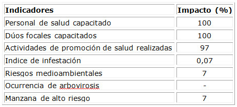 La tabla 5 representa el impacto de la estrategia: el 100 % del personal de salud y los dúos focales fueron capacitados. Se realizaron actividades de educación para la salud en el 97 % de la población, se redujo el índice de infestación de 2 a 0,07 %, y se redujeron los riesgos medioambientales en un 86,2 %. Las manzanas del estrato I se redujeron a 7, y la ocurrencia de arbovirosis a 0.