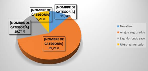 Para corroborar el diagnóstico se realizó ecografía, la que constató a los anejos engrosados como el hallazgo más frecuente; solo hubo 9 de estas en las que no se detectaron alteraciones ecográficas. (Gráf. 1)