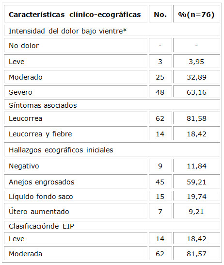 En la tabla 1 se muestran las características clínico-ecográficas. Se aprecia que predominó el dolor severo. Delos síntomas asociados, la leucorrea resultó el más frecuente, presente en el total de las féminas, solo o asociado a la fiebre. Hubo un predominio de los casos clasificados como EIPA moderada sobre los clasificados como EIPA leve.