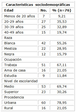 La tabla 2 muestra las características sociodemográficas de las pacientes incluidas en el estudio. Predominó el grupo etario entre los 20 y 39 años, siendo la media de edad de 31,2. Respecto a las restantes variables, se encontró un predominio de la raza blanca, con más del 50 %. Las mujeres vinculadas laboralmente representaron el 67,1 %, con nivel medio de escolaridad el 69,74 %, y la procedencia urbana fue mayor.