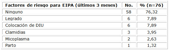 Concerniente a los factores de riesgo para EIPA (tabla 3), en la mayor parte de las pacientes (76,32 %) no se encontró ninguno. Entre las que presentaron alguno, los relacionados con la manipulación de los genitales (legrado y colocación de DIU) fueron los más frecuentes (12 pacientes).