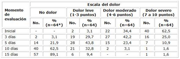La evaluación realizada a los 15 días de iniciado el tratamiento encontró que el 89,1 % de las pacientes estaba sin dolor, y que solo una paciente se mantuvo con dolor severo.