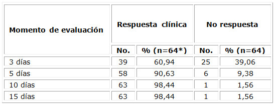 Al tomar como punto base la intensidad del dolor antes de iniciar el tratamiento, se consideró respuesta clínica si se constató reducción de la misma de una medición a otra en al menos 20 mm al tercer, quinto, décimo y decimoquinto día del tratamiento. Otra variable para evaluar la respuesta al tratamiento fue la evolución de los hallazgos ecográficos con la constatación de la remisión o persistencia de los mismos en la ecografía transvaginal evolutiva, al quinto día de tratamiento.