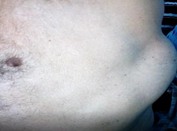 Al examen físico se constató una masa en región lateral izquierda del tórax, de aproximadamente 10 cm de diámetro, blanda, dolorosa, que protruía tras la maniobra de Valsalva. (Fig. 1)