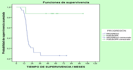 Se confirman, en el estudio, 8 pacientes pseudoprogresores (1 inmunizado con Racotumomab y 7 con CIMAvax-EGF). Al determinar los porcientos de la pseudoprogresión se describe que con Racotumomab aparece el 12,5 % de los pacientes y con CIMAvax-EGF el 28 %. En el gráfico se representa la supervivencia que alcanzaron los pacientes con CPCNP en estadios IIIB y IV, tratados con la inmunoterapia cubana Racotumomab y CIMAvax-EGF después de la primera línea de tratamiento con QT o QT-RT, según estrato de progresores o pseudoprogresores, y se observa que en los pacientes que pseudoprogresaron -a pesar de que fue una cifra menor que la de los que progresaron- se mantiene una línea recta de estabilidad de la enfermedad a partir de los 22 meses, y que alcanzan una supervivencia de 105 meses. El estrato de progresor tuvo una supervivencia de 78 meses, con estabilización a partir de los 36 meses.