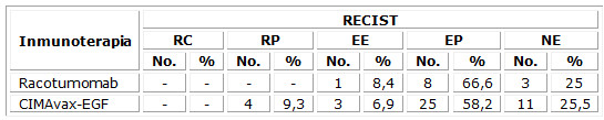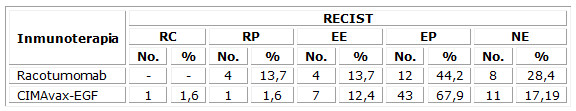De los 91 pacientes incluidos en la presente investigación, 30 se encontraban en la etapa IIIB y 61 en la IV. El 85,71 % de los individuos presentaba ECOG igual 1 en el momento que comenzaron con la inmunoterapia; el resto alcanzó el 2 de la escala, con mínimas restricciones en su vida diaria. Fueron inmunizados 27 pacientes con Racotumomab y 64 con CIMAvax-EGF. En la tabla 1 se aprecia que la EP alcanzó los mayores porcientos de respuesta en cada grupo de vacunas: 44,2 % en los tratados con Racotumumab y 67,19 % en los de CIMAvax-EGF. (Tabla 1)