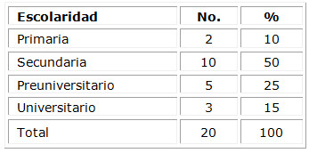 De la muestra estudiada el 45 % pertenecía al grupo de edad entre 14 y 18 años. El nivel de escolaridad que prevaleció en las gestantes fue el nivel secundario, para un 50 %, seguido del nivel preuniversitario, con un 25 %. (Tabla 1)