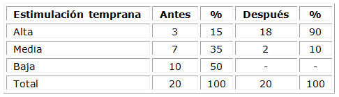 Antes de la intervención educativa predominó un nivel de conocimiento bajo sobre la estimulación temprana en el 50 % de las gestantes, seguido de un nivel de conocimiento medio en el 35 %. Luego del programa se comprobó un nivel de conocimiento alto en el 90 % de la muestra. (Tabla 2)