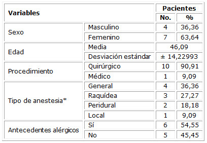 Resultados: de los 11 pacientes estudiados, 10 tuvieron reacciones en procedimientos quirúrgicos. La media de edad fue de 46,09 años, con una relación por sexo de 0,57 casos masculinos por cada caso femenino. Cinco pacientes (45,45 %) desarrollaron el grado máximo de severidad de la anafilaxia. Los agentes anestésicos fueron la causa de la anafilaxia en dos de los cuatro pacientes sometidos al método de anestesia general y en dos de los cinco sometidos al método de anestesia regional. Por su parte, el látex resultó ser el agente causal en el 45,45 % de los pacientes.